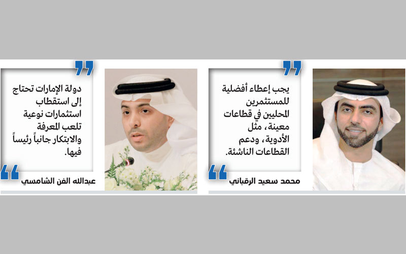 وشدد الشامسي على أهمية الحاجة إلى آليات لتوصيل الرسالة للمستثمر الأجنبي بهذه التطورات، والكيفية التي يستطيع بها تعظيم الاستفادة من البنية الاستثمارية المتوافرة في الدولة، لافتاً إلى أن الدولة تحتاج إلى استقطاب استثمارات نوعية يلعب الجانب المعرفي والابتكاري جانباً رئيساً منها، وذلك وفقاً لاستراتيجية الابتكار الخاصة بالدولة التي تم إعلانها سابقاً.