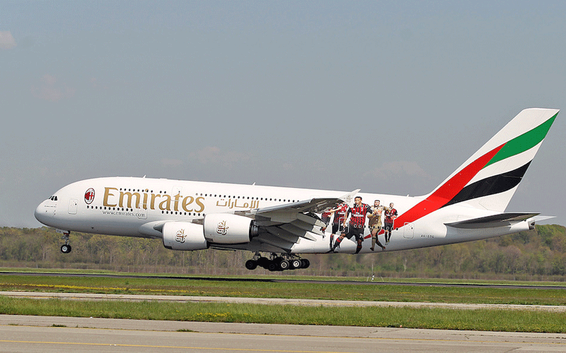 بالصور.. ملصق ضخم للاعبي "إيه سي ميلان" على "A380 الإماراتية"