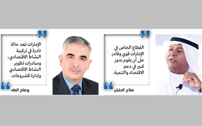 وقال المحلل المالي، وضاح الطه إن «الإمارات تعدّ حالة نادرة في تركيبة النشاط الاقتصادي والمبادرات الخاصة بتطوير النشاط الاقتصادي وإدارة المشروعات، إذ إن القطاع الخاص يقود التقدم في العديد من دول العالم المتقدم، بينما يقود القطاع الحكومي العديد من المبادرات ويمهد الطريق للقطاع الخاص في الإمارات».