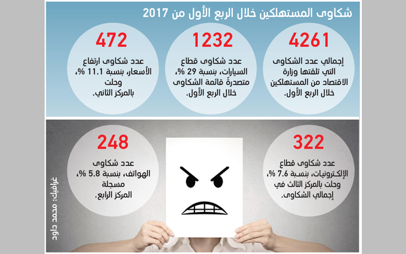 وتفصيلاً، تلقت وزارة الاقتصاد نحو 4261 شكوى من المستهلكين، خلال الربع الأول من العام الجاري، وذلك وفقاً لتقرير الشكاوى الصادر عن الوزارة أمس، حيث تصدرت السيارات عدد الشكاوى الواردة للوزارة خلال الربع الأول بنسبة 29%، وبلغ عددها 1232 شكوى، منها 1028 شكوى تتعلق بالسيارات، و204 شكاوى تتعلق بقطع الغيار والإطارات. وحلّت شكاوى ارتفاع الأسعار في المركز الثاني بنسبة 11.1%، وبلغ عددها 472 شكوى، تليها شكاوى الإلكترونيات بالمركز الثالث بنسبة 7.6%، وبلغ عددها 322 شكوى. كما حلت شكاوى الهواتف بالمركز الرابع بنسبة 5.8%، بإجمالي 248 شكوى، تليها شكاوى العقارات بنسبة 4.6% بإجمالي 197 شكوى، ثم شكاوى المفروشات بعدد 97 شكوى، وتلتها بطاقات الائتمان بعدد 14 شكوى، بنسبة لا تتجاوز 1% لكل منهما.