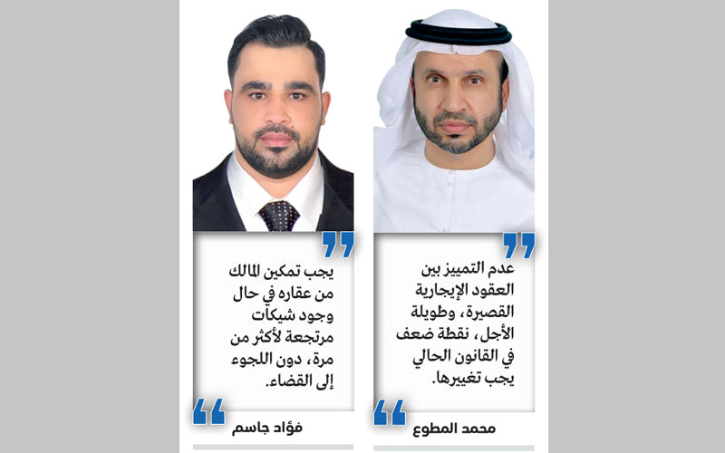 من جانبه، رأى المالك العقاري فؤاد جاسم، أن البنود التي تمكّن المالك من عقاره في حال النزاع القضائي مع المستأجر تحتاج إلى مزيد من التدقيق، لافتاً إلى العديد من الصعوبات التي تواجه الملاك، منها شروط نزع العقار من المستأجر، وطول المدة القانونية لإعادة تأجير العقار مرة ثانية في حال نزع الوحدة السكنية أو المحل التجاري للأغراض الشخصية، التي تصل إلى عامين في حالة «السكني»، وثلاث سنوات في حال «التجاري».