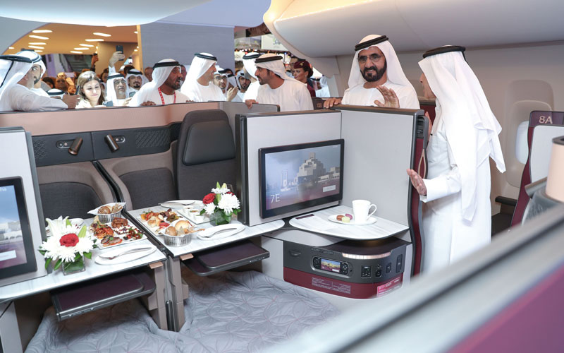 وتوقف سموه كذلك عند أجنحة إمارة أبوظبي وسلطنة عمان وقطر والكويت، ثم جناح «طيران الإمارات»، إذ اطلع سموه على جديد الشركة في مجال تحديث أسطولها العملاق، وتوفير أعلى درجات الراحة والاستمتاع لركابها على متن طائراتها الحديثة، وتوفير الرفاهية في المقاعد والخدمات التي تقدمها على متن طائراتها، والتي تعتبر من أرقى وأفضل الخدمات الداخلية في شركات طيران العالم، لاسيما طائرات «إيرباص A 380»، و«بوينغ 777».