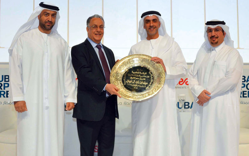 تسلم الفريق سمو الشيخ سيف بن زايد آل نهيان، نائب رئيس مجلس الوزراء وزير الداخلية، درع الرئاسة الفخرية للاتحاد العربي للتجارة الإلكترونية، من الأمين العام لمجلس الوحدة الاقتصادية العربية، السفير محمد محمد الربيع، على هامش فعاليات مؤتمر «الاقتصاد الرقمي»، بعنوان «تجارة إلكترونية بلا معوقات».