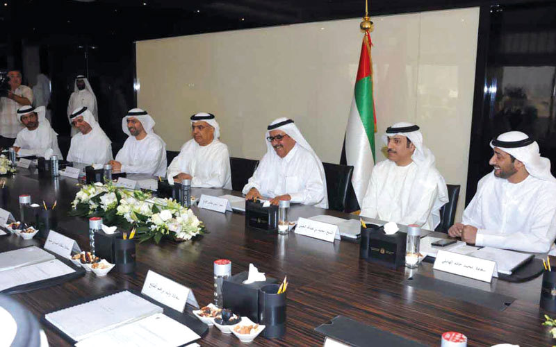 حمدان بن راشد خلال ترؤسه أول اجتماع لمجلس إدارة الهيئة الاتحادية للضرائب. من المصدر