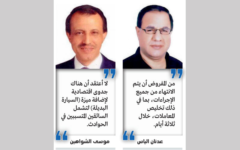 إلى ذلك، قال المدير التنفيذي لشركة «ماي بارتنرز» لاستشارات التأمين وإدارة المخاطر، موسى الشواهين، إنه «بالنسبة للسائقين الذين تسببوا في حوادث مرورية، ويتكبدون خسائر كبيرة جراء تأخر صيانة مركباتهم، بإمكانهم أيضاً أن يتفادوا ذلك من خلال إضافة منفعة توفير سيارة بديلة أثناء الحوادث، وذلك مقابل قسط محدد».