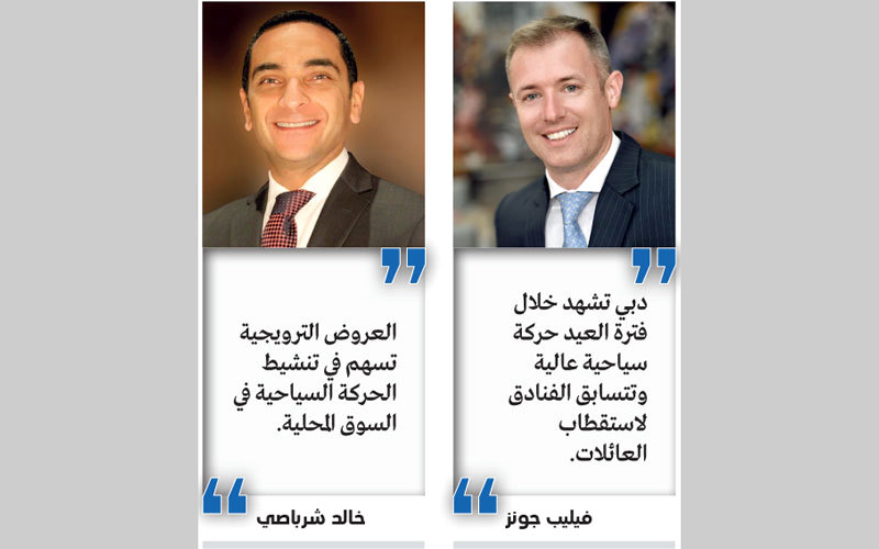 من جانبه، قال المدير العام لفندق «موڤنبيك جميرا بيتش»، فيليب جونز، «تشهد دبي خلال فترة العيد حركة سياحية عالية، وتتسابق الفنادق لاستقطاب العائلات من السوق المحلية ودول الخليج العربي، والتأثير الإيجابي لذلك في نسب الإشغال، وأيضاً في المرافق والمطاعم».