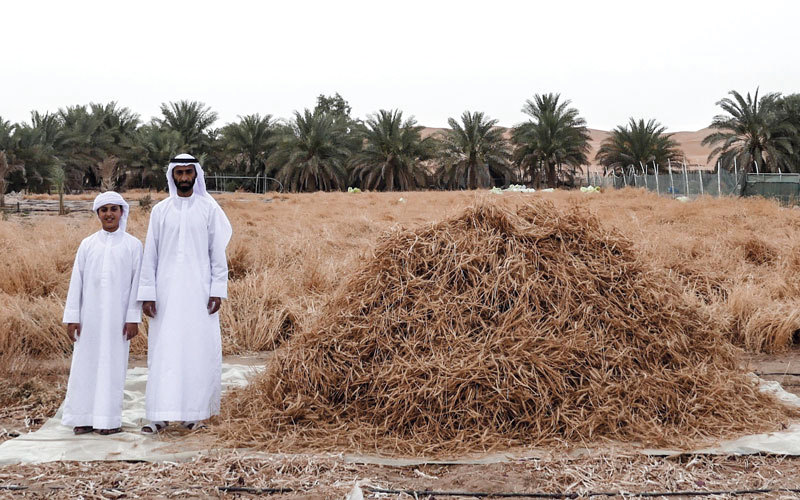 وأشار إلى أن نتائج الحصاد كانت مبشرة، وأنتجت حبات قمح تمتاز بالقيمة الغذائية الموجودة بالأسواق، وبتكاليف إنتاج معقولة، وكميات مياه منخفضة، وأيدٍ عاملة قليلة، حيث بلغت كمية الإنتاج 1200 كيلوغرام من حبات القمح، و2500 كيلوغرام من الأعلاف، مضيفاً أن هذه التجربة تعد الأولى على مستوى منطقة الظفرة، وقد لاقت نجاحاً فاق توقعاته، حيث سيعمل على التوسع في زراعة القمح ضمن مساحة أكبر، ليصل إلى مرحلة التصدير إلى الأسواق المحلية.