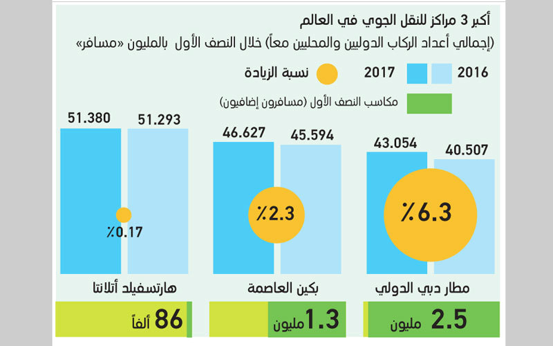 وتعامل مطار هارتسفيلد أتلانتا، الذي يُعد الأكبر في العالم، مع 51.38 مليون مسافر، خلال الفترة الممتدة بين يناير ويونيو من العام الجاري، مقابل 51.29 مليون مسافر خلال الفترة ذاتها من عام 2016، فيما تعامل مطار بكين العاصمة، الذي يحتل المركز الثاني، مع 46.62 مليون مسافر مقابل 45.59 مليوناً في الفترة المماثلة من عام 2016، ليسجل مطار دبي الدولي، المصنف ثالثاً، 43.054 مليوناً، مقابل 40.509 مليون مسافر خلال الأشهر الستة الأولى من العام الماضي.