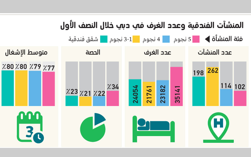 وبلغ متوسط العائد على الغرفة 414 درهماً، مقابل 419 درهماً، خلال النصف الأول من عام 2016، فيما بلغ متوسط إقامة الزائر الواحد 3.9 ليال. واستحوذت المنشآت الفندقية من فئة خمس نجوم على 34% من إجمالي السعة الفندقية في دبي، مسجلة 35 ألفاً و141 غرفة فندقية ضمن 102 منشأة، وبلغت حصة الفنادق من فئة أربع نجوم 22%، بعد أن بلغ عدد غرفها 23 ألفاً و182 غرفة، ضمن 114 منشأة فندقية.