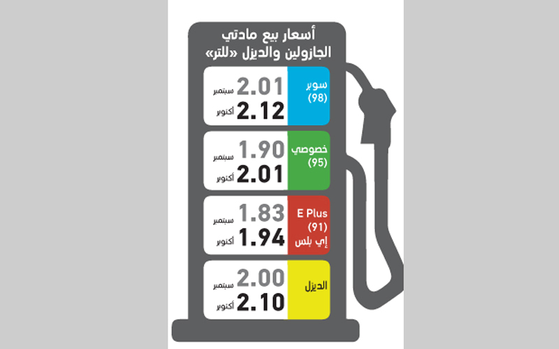 وسيبلغ سعر لتر وقود جازولين «خصوصي 95»، 2.01 درهم، مقارنة مع 1.9 خلال الشهر الجاري، بزيادة قدرها 11 فلساً، تعادل نسبة نمو 5.8%، كما سيرتفع سعر وقود جازولين «إي بلس 91» إلى 1.94 درهم مقابل 1.83 درهم في سبتمبر الجاري، بزيادة قيمتها 11 فلساً، ونسبتها 6%.