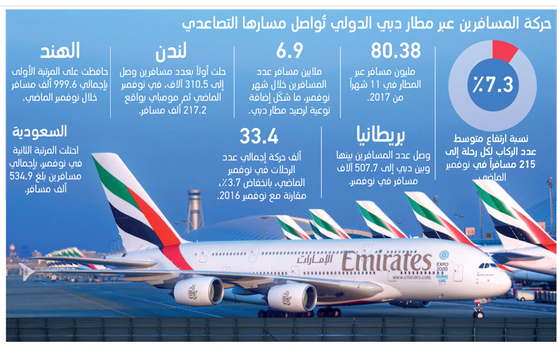 أفادت مؤسسة «مطارات دبي» باستمرار الاتجاه التصاعدي في حركة المسافرين عبر مطار دبي الدولي، حيث ارتفع إجمالي عدد مستخدمي المطار في الفترة بين يناير ونوفمبر 2017 إلى 80 مليوناً و387 ألفاً و442 مسافراً، بنمو نسبته 5.8%، مقارنة بالفترة نفسها من عام 2016، التي وصل فيها إجمالي عدد المسافرين إلى 75 مليوناً و947 ألفاً و899 مسافراً.