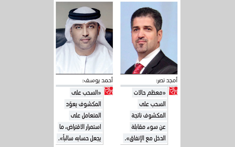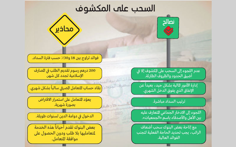 حذر خبراء مصرفيون متعاملي البنوك من اللجوء إلى السحب على المكشوف، أو ما يعرف مصرفياً بـ«أوفر درافت»، إلا في أضيق الحدود وعند الحاجة الماسة إليه، مشيرين إلى أن الاقتراض المقدم لراتب المتعامل يوقعه في دوامة الرصيد السالب دوماً، ويحمله أعباء فوائد تراوح بين 18 و30% بالنسبة للبنوك التقليدية، فضلاً عن رسوم تقديم الطلب كل شهر وتبلغ 200 درهم، بالنسبة للمصارف الإسلامية.