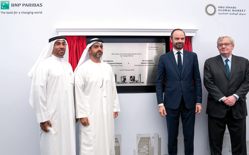 شهد سمو الشيخ حامد بن زايد آل نهيان، رئيس ديوان ولي عهد أبوظبي، ورئيس الوزراء الفرنسي إدوارد فيليب، مراسم إعلان سوق أبوظبي العالمي، أمس، عن انضمام «مجموعة بي إن بي باريبا» BNP Paribas، إلى قائمة الأسماء الدولية الموجودة في السوق.