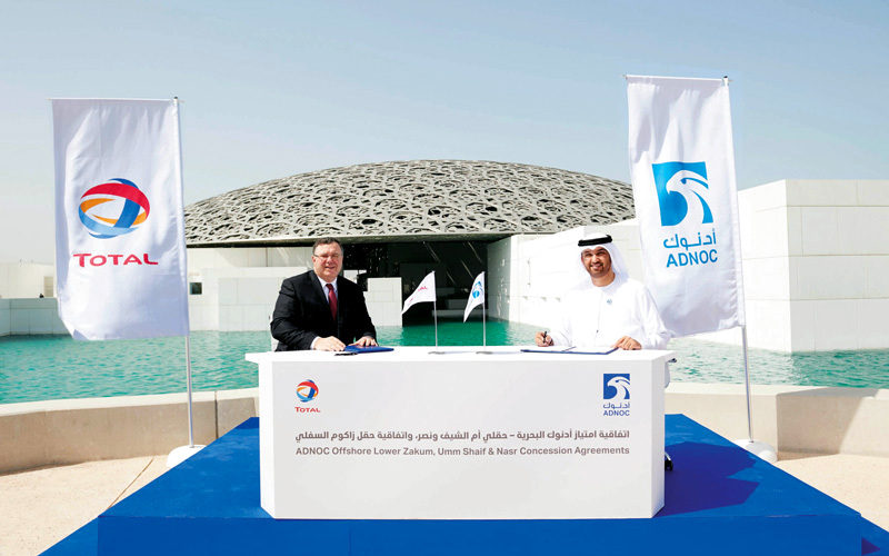 وقدمت «توتال» 4.2 مليارات درهم (1.15 مليار دولار) رسم مشاركة في امتياز «أم الشيف ونصر»، و1.1 مليار درهم (300 مليون دولار)، رسم مشاركة في امتياز «زاكوم السفلي» اللذين ستتولى إدارتهما «أدنوك البحرية»، إحدى شركات مجموعة «أدنوك» نيابة عن الشركاء الآخرين.