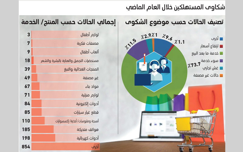 وبين أن 63% من هذه الشكاوى، أو 1271 شكوى، تعلقت بخدمة ما بعد البيع، و11.5% تعلقت بسوء الخدمة، فيما تعلقت 8.5% منها بارتفاع الأسعار، و4.6% كانت خاصة بالغش التجاري، بينما توزعت البقية على شكاوى متنوعة وغير مصنفة.