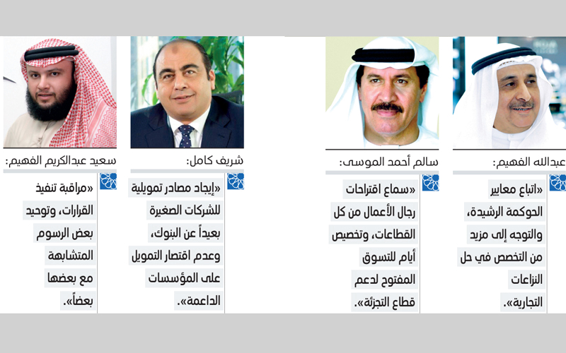 وطالب رجال الأعمال بتشريع يجبر الشركات على اتباع معايير الحوكمة الرشيدة، التي تصب في مصلحة اقتصاد الإمارة قبل الشركة، فضلاً عن مزيد من التخصص في حل النزاعات التجارية، مؤكدين أن التخصص هو الذي سيعطي مجالاً لحلول أسرع لهذه النزاعات. وشدّدوا على أهمية إيجاد مصادر تمويلية للشركات الصغيرة بعيداً عن البنوك، وعدم إقصار عمليات التمويل على الشركات التي تعمل تحت مظلة المؤسسات الداعمة، ومراقبة تنفيذ القرارات، فضلاً عن توحيد بعض الرسوم المتشابهة مع بعضها بعضاً.