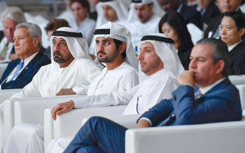 مكتوم بن محمد وأحمد بن سعيد خلال المؤتمر والمعرض الدولي السنوي الرابع للمنظمة العالمية للمناطق الحرة. وام