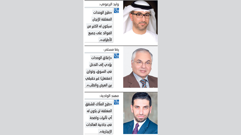 في السياق نفسه، قال رئيس مجلس إدارة شركة «دبليو كابيتال»، وليد الزرعوني، إنه «لا صحة لتخوف الملّاك المتعلق بتراجع العائد الاستثماري لعقاراتهم في حال طرح الوحدات المغلقة للإيجار، وذلك لأن نسبة التراجع تكون غير مؤثرة في العائد الاستثماري، ولا توازي الخسائر التي يتكبدها الملّاك أنفسهم والاقتصاد الوطني في حال ترك الوحدات السكنية مغلقة لفترات زمنية طويلة».