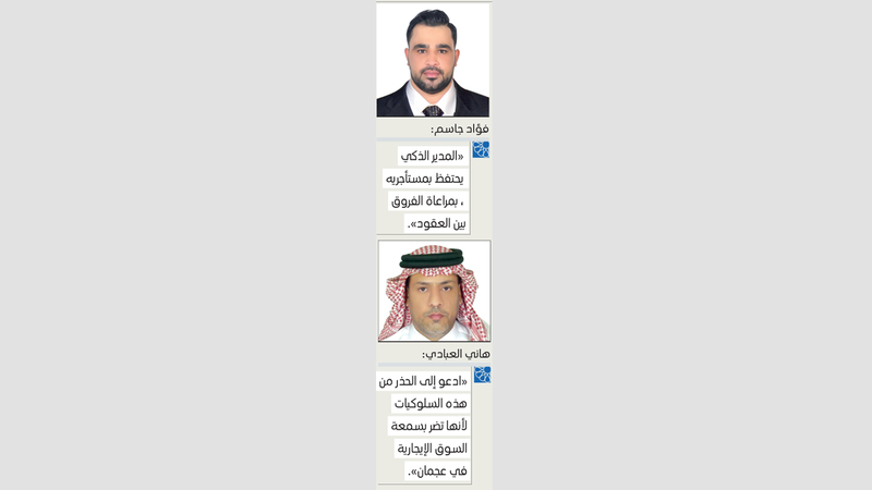 من جانبه، قال صاحب «مكتب النشمي للعقارات»، هاني العبادي، إن «هناك تراجعاً في إيجارات عجمان بشكل كبير، ما سمح بوجود الكثير من الاختلافات في العقود الايجارية، وهو أمر وارد، لكن من غير الطبيعي تأجير الوحدة السكنية نفسها لمستأجر جديد بقيم أقل بكثير من العقود القديمة بالبناية»، مطالباً بضرورة الحذر من هذه السلوكيات لأنها تضر بسمعة السوق الإيجارية بعجمان، وعلى مديري العقارات مراعاة أن تكون القيم الايجارية متقاربة بين العقود الإيجارية القديمة والجديدة.
