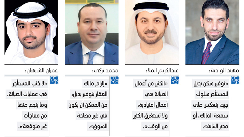 في السياق نفسه، قال المدير العام لشركة «إيموفاليو» المتخصصة في التقييم العقاري، عمران الشرهان، إن من واجب ملاك العقارات، أو من ينوب عنهم، توفير بديل في حال إجراء عمليات صيانة تستوجب فترة زمنية طويلة نسبياً.