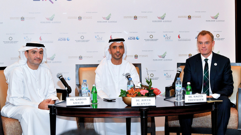 العفيفي «وسط» أكد خلال المؤتمر أنه يوجد في الإمارات 320 ألف شركة صغيرة ومتوسطة. تصوير: نجيب محمد