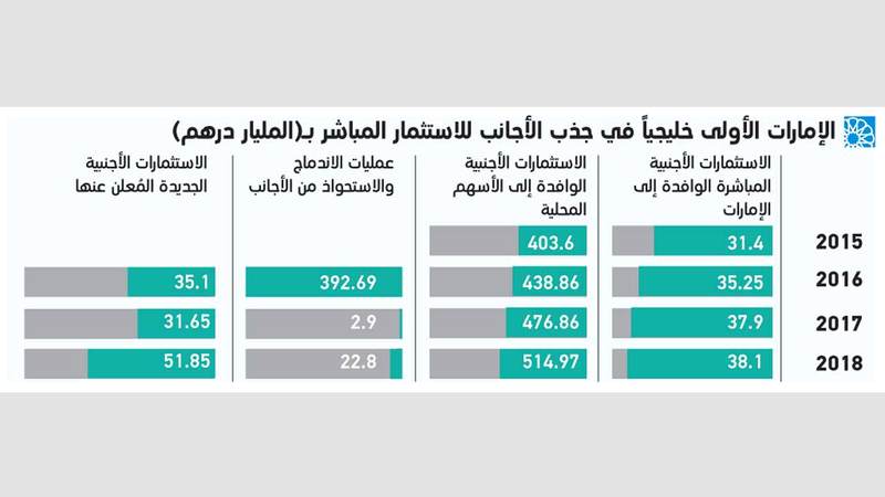 ووفقاً لتقرير مؤتمر الأمم المتحدة للتجارة والتنمية، نجحت دولة الإمارات في جذب استثمارات أجنبية مباشرة خلال عام 2018 بقيمة 10.4 مليارات دولار (نحو 38.1 مليار درهم) مستحوذة بذلك على 36% من إجمالي الاستثمارات الأجنبية المباشرة المتدفقة إلى الدول العربية، لتتصدر بذلك عربيا وخليجيا، بينما حلت في المرتبة الثانية على مستوى منطقة غربي آسيا مستحوذة على 33.4% من إجمالي تدفقات الاستثمار الأجنبي المباشر الواردة إلى هذه المنطقة.