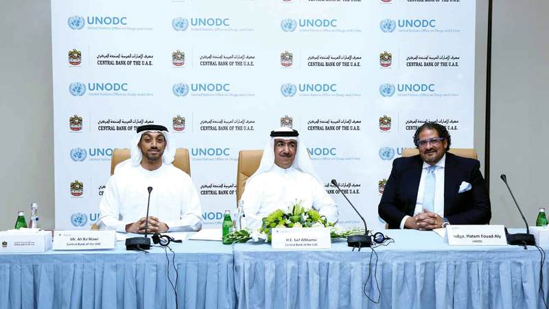 الشامسي (وسط) أكد أن التعاون مع مكتب الأمم المتحدة لا يعني مشاركة التقارير المتعلقة بالمعاملات المشبوهة. من المصدر