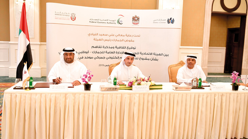 وقّعت الهيئة الاتحادية للجمارك اتفاقية ومذكرة تفاهم مع كل من الإدارة العامة للجمارك في أبوظبي وجمارك دبي، في إطار مشروع تطبيق نظام إلكتروني جمركي موحد في الدوائر الجمركية والمنافذ الحدودية بالدولة.