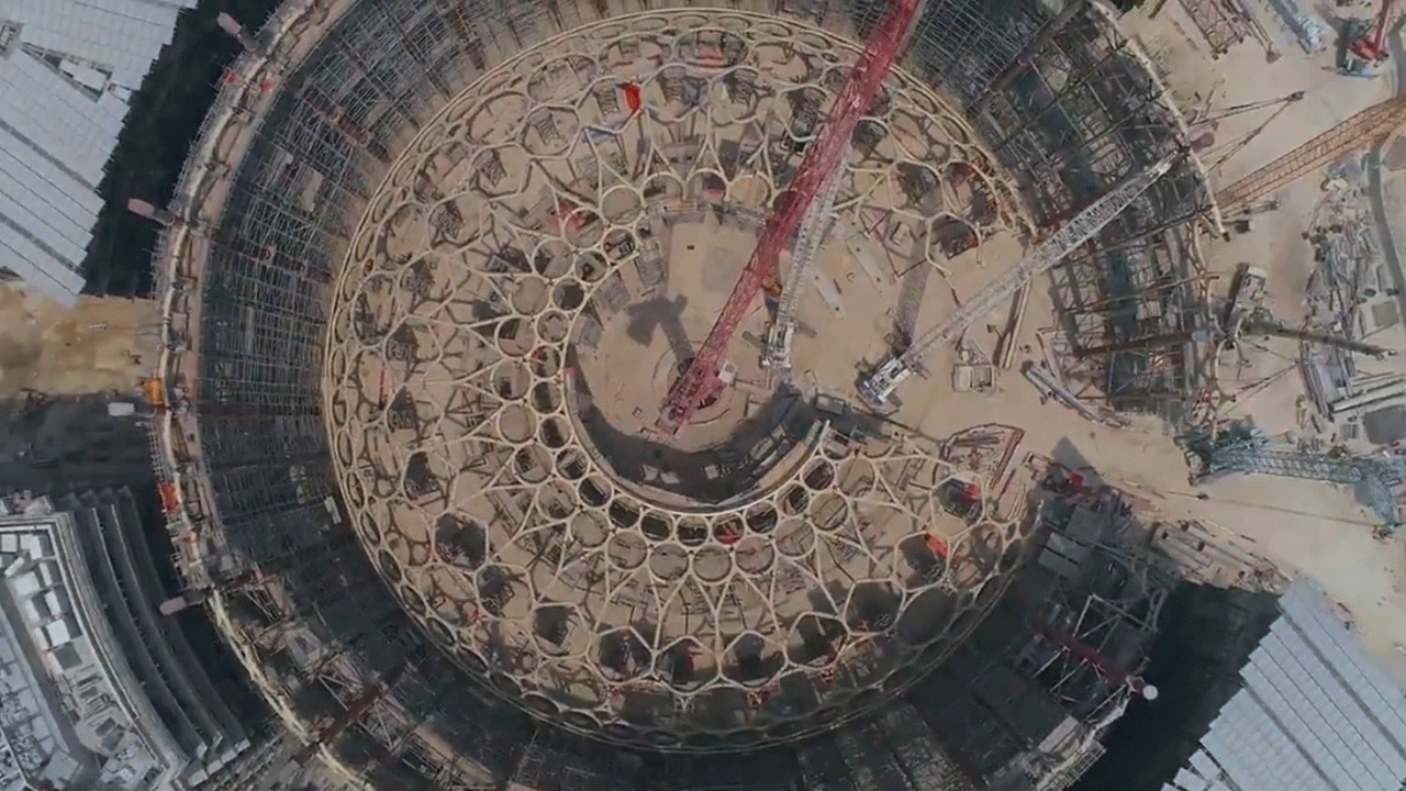 نشر الحساب الرسمي لمعرض إكسبو 2020 دبي عبر موقع التواصل الاجتماعي "تويتر" لقطات فيديو تظهر قرب اكتمال الشبكة الفولاذية لقبة ساحة الوصل "الوصل بلازا" القلب النابض لموقع المعرض.