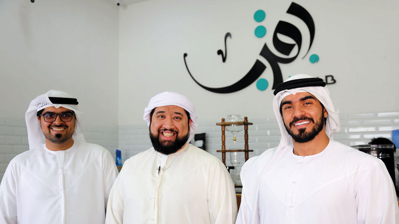 الشحي (وسط) مع اثنين من شركائه في «إقرب كافيه». من المصدر