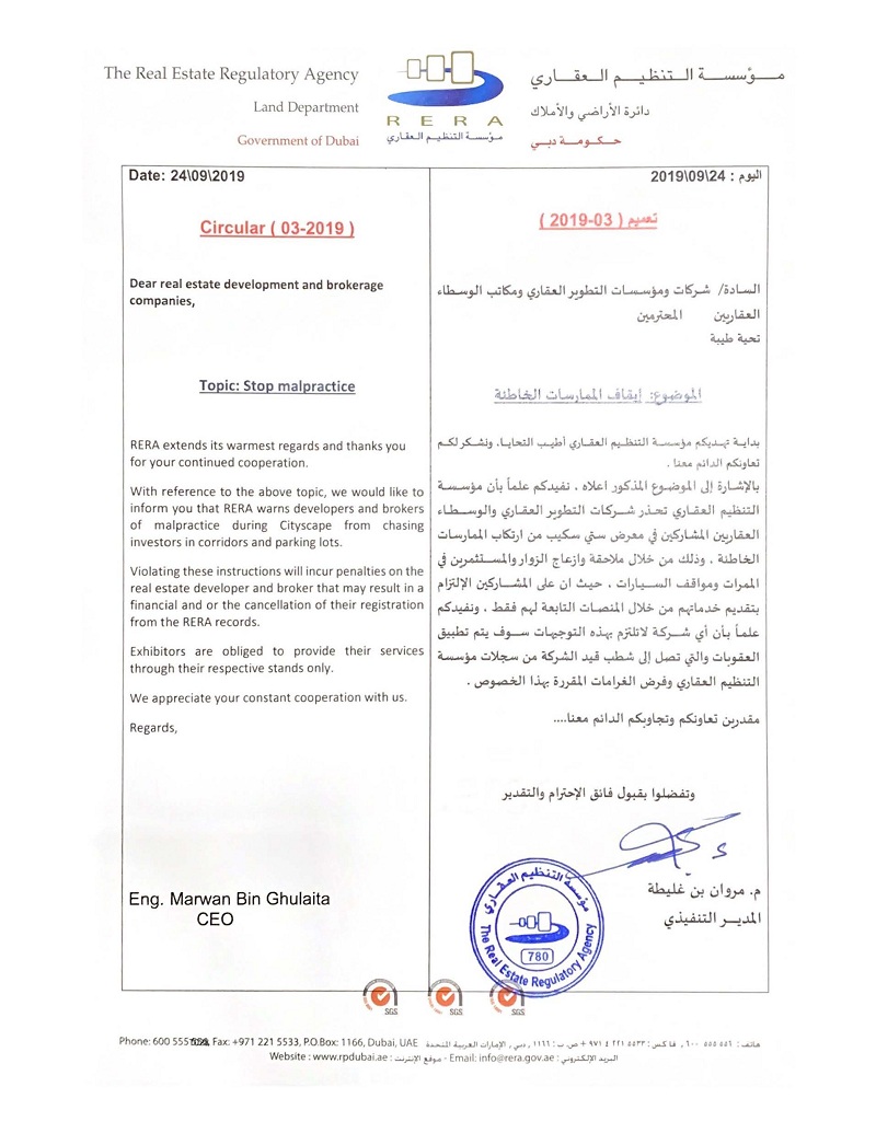 اطلعت «الإمارات اليوم» على وثيقة صادرة من مؤسسة التنظيم العقاري (ريرا)، الذراع التنظيمية لدائرة الأراضي والأملاك بدبي، تحذر فيها المشاركين في معرض سيتي سكيب جلوبال دبي، والذي يبدأ غداً ولمدة ثلاثة أيام، من مخالفة القوانين واللوائح، مشيرة إلى أن هناك عقوبات سيتم فرضها على المطورين والوسطاء العقاريين، في حال ارتكاب هؤلاء ممارسات خاطئة تتجاوز القوانين واللوائح المنظمة لعمل هؤلاء داخل المعرض، لافتة إلى أن العقوبات تصل حتى شطب الشركة.