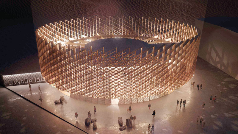 الجناح الكندي يقع في منطقة «الاستدامة»، وهو مصمم على شكل هيكل خشبي أسطواني يذكّر بالطبيعة الكندية، وتصميم معماري عربي، ويتضمن مسرحاً دائرياً بنطاق 360 درجة يحكي قصة كندا، بعناصر مستوحاة من «المشربية» العربية، ليرمز بذلك إلى الصلات الثقافية الوثيقة بين كندا ودولة الإمارات.