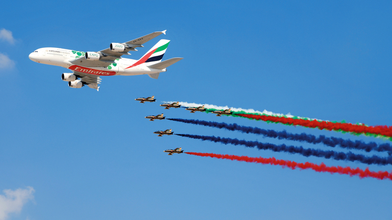 دشنت طائرة «الإمارات A380» العرض الجوي في «معرض دبي للطيران 2019»، أمس، بتشكيل مشترك مع 26 طائرة عسكرية وفريق الفرسان الإماراتي للاستعراضات الجوية.