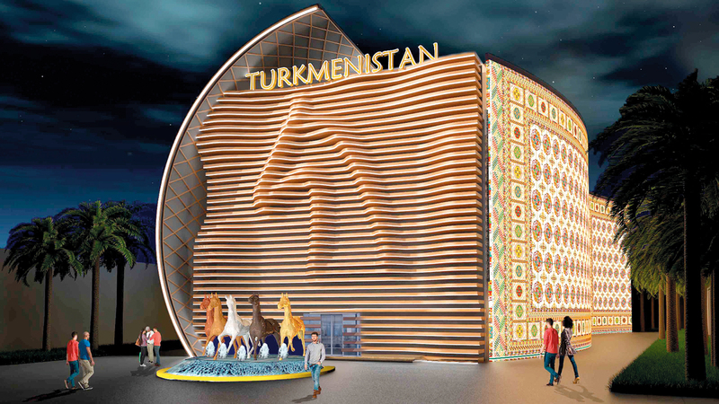 ويضم الجناح، الذي يقع ضمن منطقة التنقل بالمعرض، نافورة منحوتة لخمسة خيول «آخال - تيكي»، مع سجادة تركمانستانية عملاقة وواجهة مضيئة بارتفاع 50 متراً.