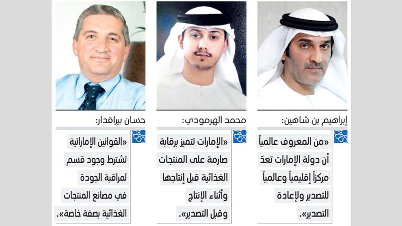 وأوضح بن شاهين أنه «في ما يتعلق بالصادرات تحديداً، فإن جميع الصادرات الغذائية تخضع لرقابة صارمة من هيئة الإمارات للمواصفات والمقاييس (مواصفات)، للتحقق من جودة المنتج ومطابقته للمواصفات القياسية الإماراتية، بما في ذلك محتويات المنتج نفسه، والبيانات الموجودة على المنتج من الخارج، كما تحصل (مواصفات) على عينات عشوائية من مختلف المنتجات الغذائية قبل تداولها داخل الدولة أو تصديرها إلى الخارج، لضمان الحفاظ على السمعة العالمية التي اكتسبها المنتج الإماراتي في الداخل والخارج على مدى السنوات الماضية».