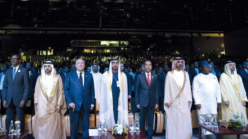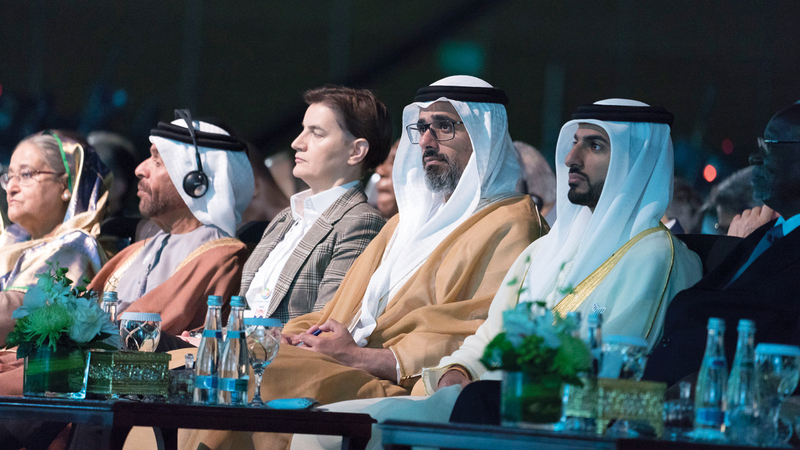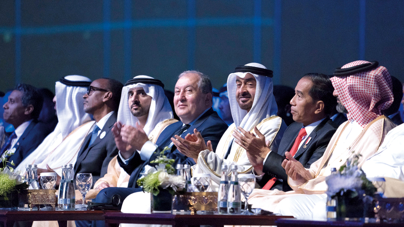 ورحّب صاحب السمو الشيخ محمد بن زايد آل نهيان، خلال الحفل الذي استهّل بالوقوف دقيقة صمت ترحماً على روح المغفور له السلطان قابوس بن سعيد، بقادة الدول وممثليها، والخبراء والضيوف.