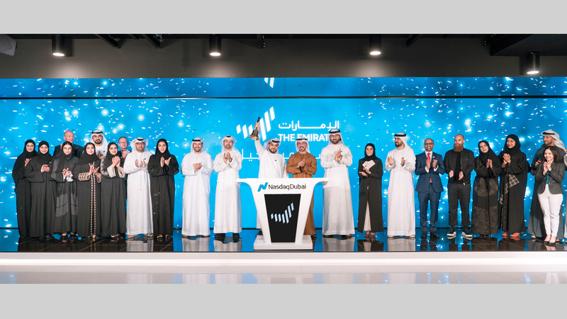 قرع جرس «ناسداك دبي» احتفاءً بالهوية الإعلامية لدولة الإمارات. ■ من المصدر