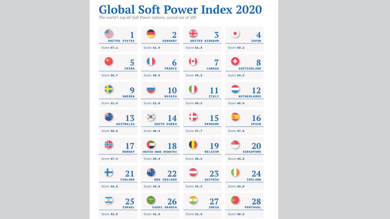 نشر صاحب السمو الشيخ محمد بن راشد آل مكتوم، نائب رئيس الدولة رئيس مجلس الوزراء حاكم دبي، في حسابه الرسمي على موقع التواصل الاجتماعي "تويتر"، نتائج تقرير مؤشر القوة الناعمة العالمي، الذي أطلقته مؤسسة براند فايننس البريطانية، بالتعاون مع جامعة أكسفورد.