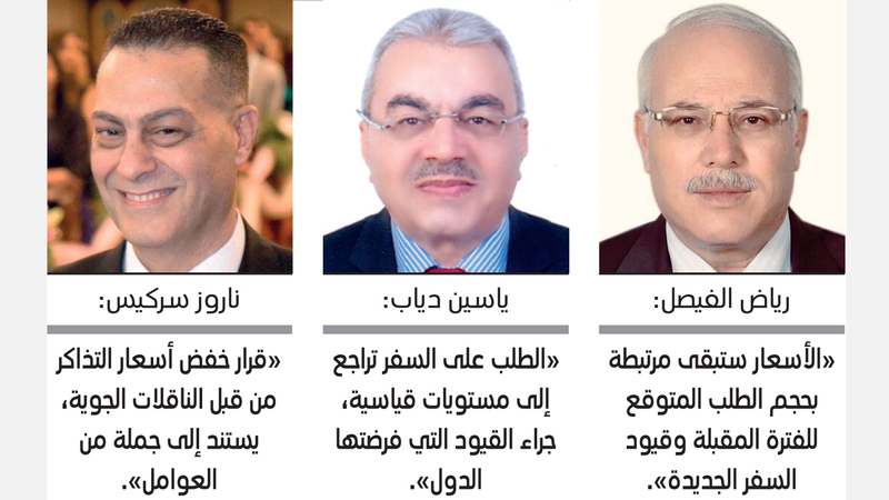 من جهته، قال المدير العام لوكالة الفيصل للسفريات والسياحة، ياسين دياب، إن شركات الطيران على الصعيد العالمي تواجه تحديات عدة، مشيراً إلى أن الطلب على السفر تراجع إلى مستويات قياسية، جراء القيود التي فرضتها مختلف الدول على حركة النقل الجوي، ومخاوف السفر بسبب فيروس «كورونا». ولفت إلى أن معظم شركات الطيران لجأت إلى خفض السعة المقعدية التي تشغلها على مختلف المحطات.