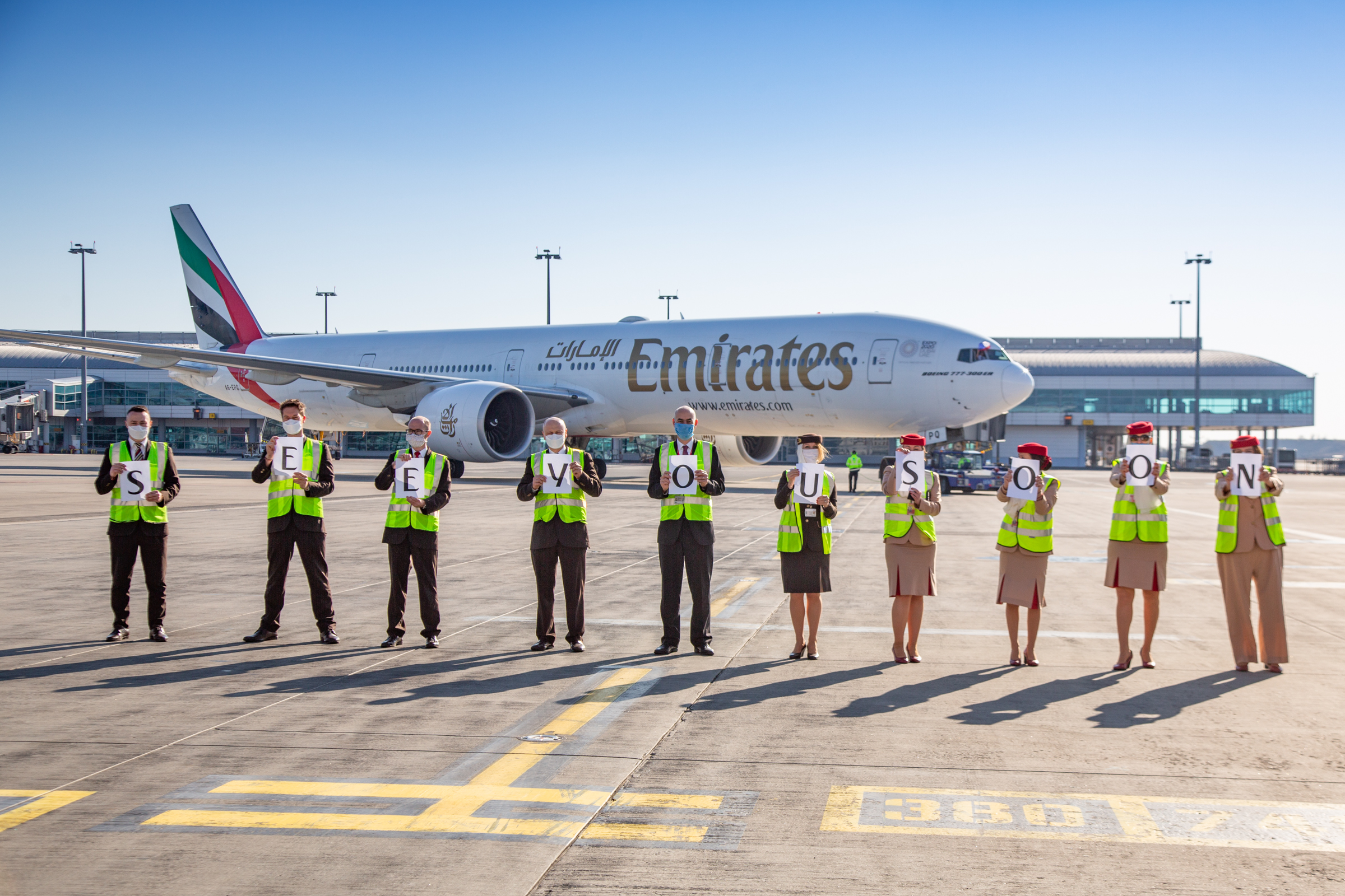 لّوح موظفو طيران الإمارات في مختلف المطارات العالمية، بأيديهم لطائرات الناقلة العائدة إلى دبي قبيل بدء سريان تعليق الرحلات مؤقتاً، على أمل اللقاء مجدداً واستئناف العمليات في وقت قريب. وكانت آخر رحلة مغادرة "ئي كيه 5" إلى لندن هيثرو قد انطلقت من مطار دبي الدولي في الساعة 4:05 عصر يوم 24 مارس، في حين كانت آخر رحلة قادمة "ئي كيه 262" التي وصلت إلى دبي من ساو باولو الساعة 22:35 ليلاً يوم 25 مارس الجاري.