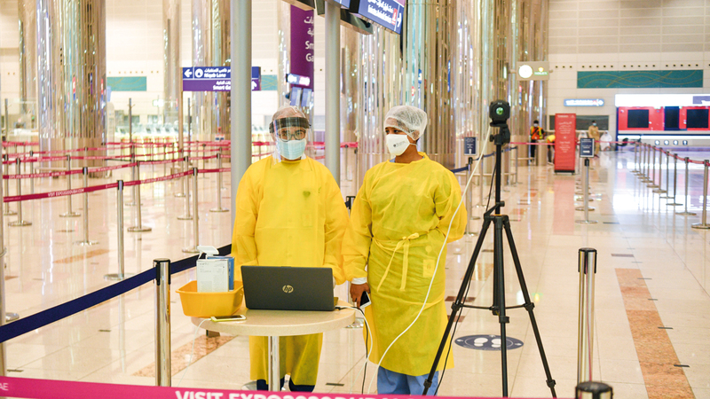 تشمل التدابير التي اعتمدها مطار دبي الدولي وجود زجاج وقائي عند تسجيل الوصول ومنافذ الجوازات، والفحص الحراري، وعلامات التباعد الجسدي، إضافة إلى زيادة مستويات التعقيم وفقاً للمعايير الدولية.
