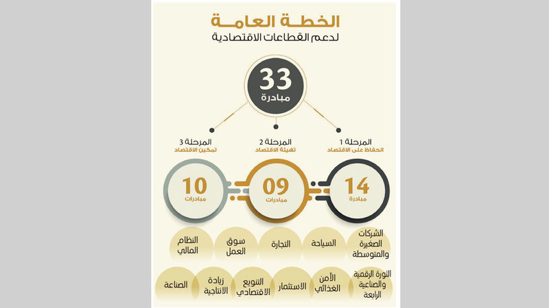 بتوجيهات صاحب السمو الشيخ محمد بن راشد آل مكتوم، نائب رئيس الدولة رئيس مجلس الوزراء حاكم دبي، واعتماد مجلس الوزراء، تستعد وزارة الاقتصاد لتنفيذ حزمة مرنة وخطة عامة لدعم القطاعات الاقتصادية، تضم 33 مبادرة على 3 مراحل، بهدف خلق بيئة اقتصادية مرنة توفر فرصاً جديدة وتشجع الاستثمار في القطاعات المستقبلية التي تدعم الرؤى والتوجهات الاستراتيجية للدولة.