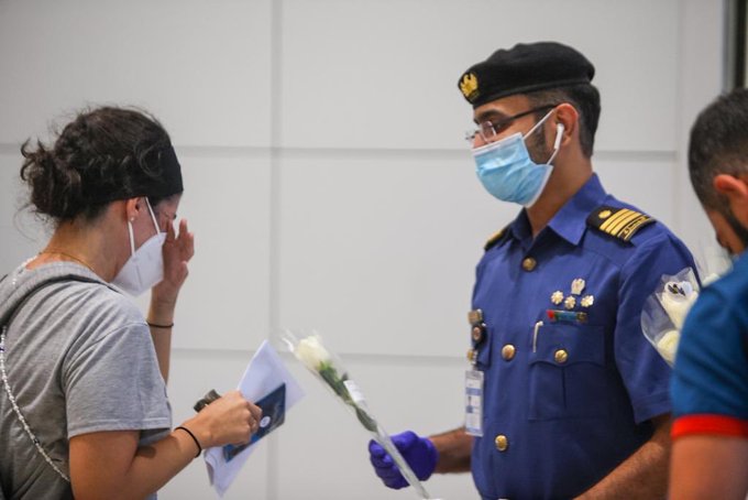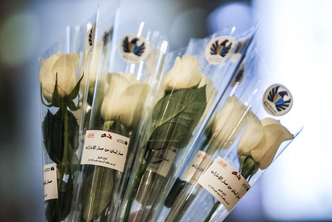 بالصور.. مطار دبي يستقبل الزوار اللبنانيين بالورود