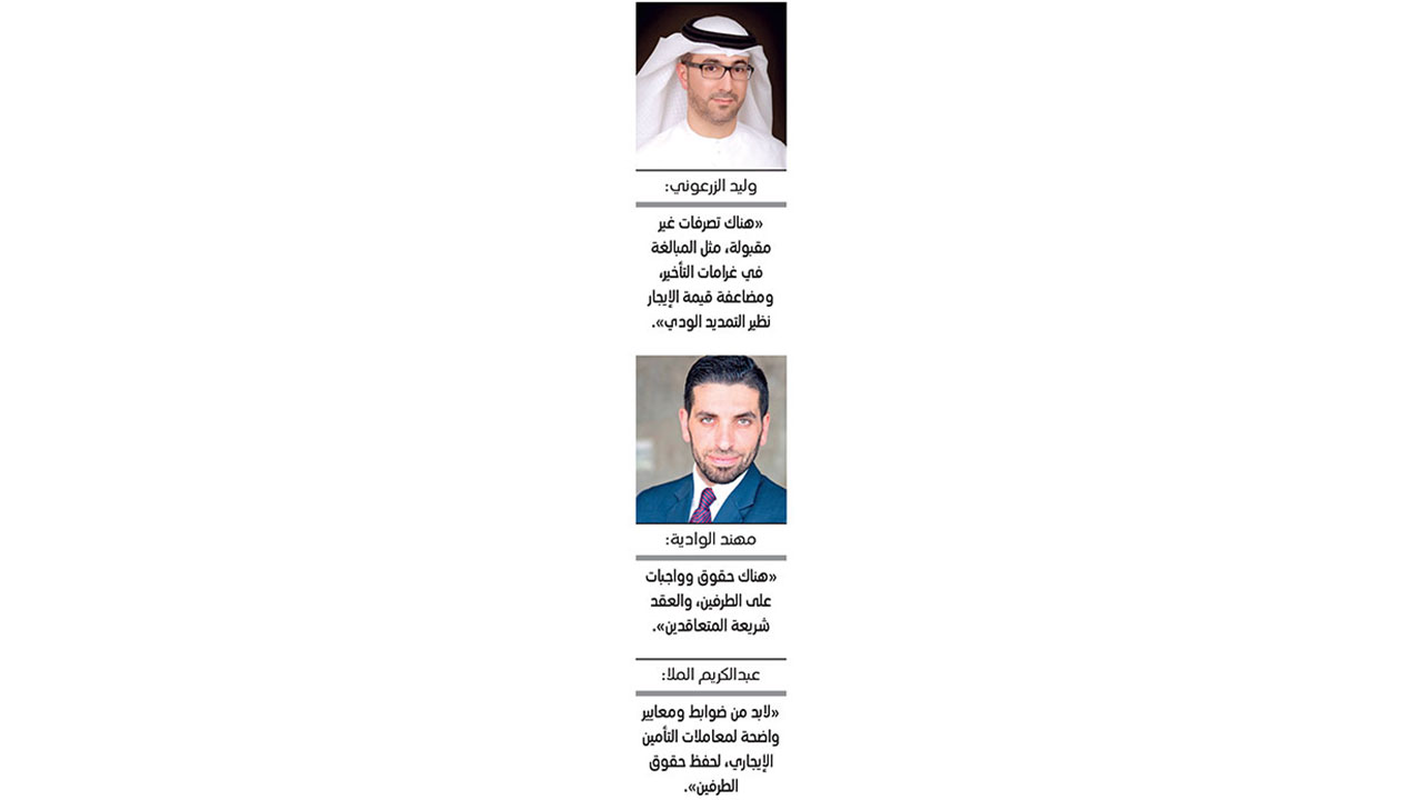بدوره، قال الرئيس التنفيذي لـ«شركة ستاندرد لإدارة العقارات»، عبدالكريم الملا، إن «هناك ممارسات سلبية لبعض شركات إدارة العقارات، بشأن سداد قيمة التأمين الإيجاري، منها استقطاع كل أو معظم قيمة مبلغ التأمين، المفترض أنه وديعة لدى المالك أو المكاتب العقارية»، مشيراً إلى أن براءة الذمة ترتبط بوفاء المستأجر بالتزاماته، ومشدداً على ضرورة وضع ضوابط ومعايير واضحة، لمعاملات التأمين الإيجاري، لحفظ حقوق الطرفين.