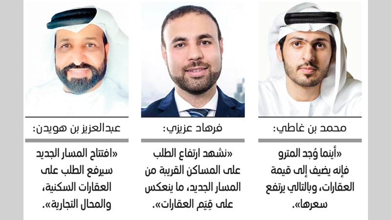 من جهته، قال المدير العام لشركة «الليوان الملكي» للعقارات، محمد حارب الفلاح: «غالباً تتأثر العقارات بجانبي المترو، بالتزامن مع ارتفاع الطلب على الوحدات السكنية والمحال التجارية في المناطق الجديدة التي يمر بها خط المترو، والتي تم افتتاح محطاتها في الفترة الأخيرة».
