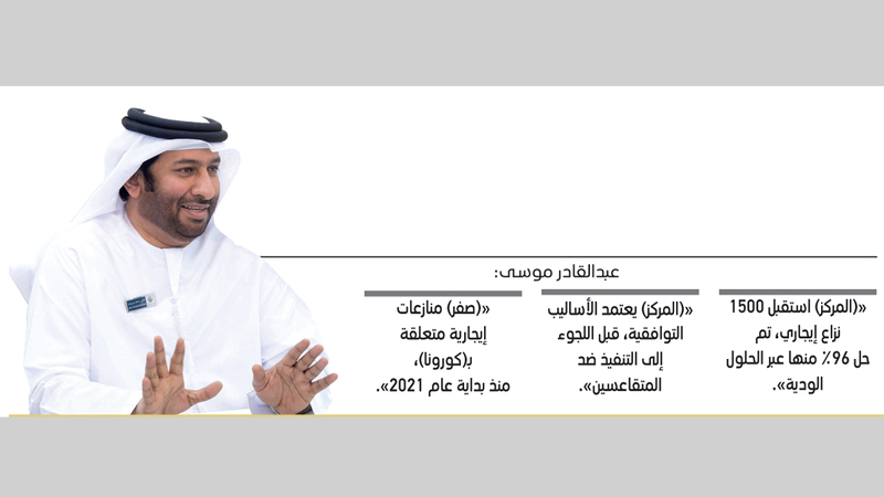 وأشار القاضي موسى إلى أنه «من الأشياء التي استفاد منها المركز، الإسراع بالاعتماد على آلية (العمل عن بُعْد) قبل ظهور (الجائحة) بفترة كبيرة، ما أسهم في التعامل مع جائحة (كورونا) بشكل إيجابي وسريع، حيث تم التعامل مع أطراف في نزاعات إيجارية بأكثر من 22 دولة، كما تم التعامل في القضايا بشكل سريع عبر آليات، مثل (الأمر على عريضة)، لاسيما في المشكلات المتعلقة بقطع المرافق الأساسية. كما تم العمل بنظام 24 ساعة في ما يخص هذه القضايا، التي ترتبط بحاجات أساسية للمتنازعين». وقال: «في بداية الأزمة، قمنا بالتعامل مع النزاعات عبر إجراءات، منها التعاون مع الدوائر الأخرى للوقوف على مدى تأثر النشاط التجاري، ومن أبرز هذه الدوائر (اقتصادية دبي)، ودائرة السياحة والتسويق التجاري. كما قمنا بمتابعة كل القرارات التي تتخذها الحكومة والمتعلقة بالأزمة، بالإضافة إلى طلب جميع المستندات التي تدعم وجهة نظر المستأجر في حال تضرره، ومنها القضايا المتعلقة بتخفيض الراتب بالنسبة للقطاع السكني، أو تضرر النشاط التجاري، والهدف من ذلك كله استمرار العلاقة الإيجارية بما يرضي الطرفين».