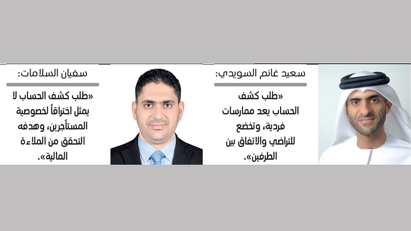 وأضاف أن «طلب كشف الحساب يعد ممارسات فردية وفقاً لسياسات كل شركة، وهو في النهاية يخضع للتراضي والاتفاق بين الطرفين، وبالتالي فالمالك من حقه فرض السياسات التي يطلبها، مادامت لا تخالف القوانين، ومن حق المستأجرين رفض تلك المطالبات والبحث عن شركة أخرى، خصوصاً في ظل توافر بدائل كثيرة في الأسواق».