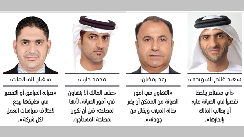 في السياق ذاته، قال المدير العام في شركة «عوض قرقاش» للعقارات، الدكتور رعد رمضان، إن «المشكلة تكمن في شركات إدارة العقارات، التي تحاول تقليص النفقات لمصلحة المالك، لكن التهاون في أمور الصيانة من الممكن أن يضر بحالة المبنى، ويقلل من جودته»، مطالباً بالمزيد من اللوائح التي تنظم العمل في ما يتعلق بأمور الصيانة.