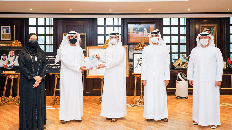 سعيد محمد الطاير خلال تسلم ختم «100% لاورقية» من وفد «دبي الذكية». وام