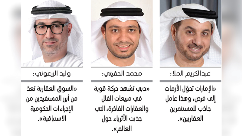 وتفصيلاً، قال الرئيس التنفيذي لشركة «ستاندرد للعقارات»، عبدالكريم الملا، إن «الأشياء المميزة في الإمارات أنها تحوّل الأزمات إلى فرص، وهذا عامل جاذب للمستثمرين العقاريين الذين يركزون على المناطق الأكثر أماناً واستقراراً خلال الأزمات، إضافة إلى التسهيلات الكبيرة المقدمة للأجانب وأصحاب المهن والباحثين في المجالات العلمية لتملك العقارات، ومنح الإقامة والبنية التحتية المتطوّرة».